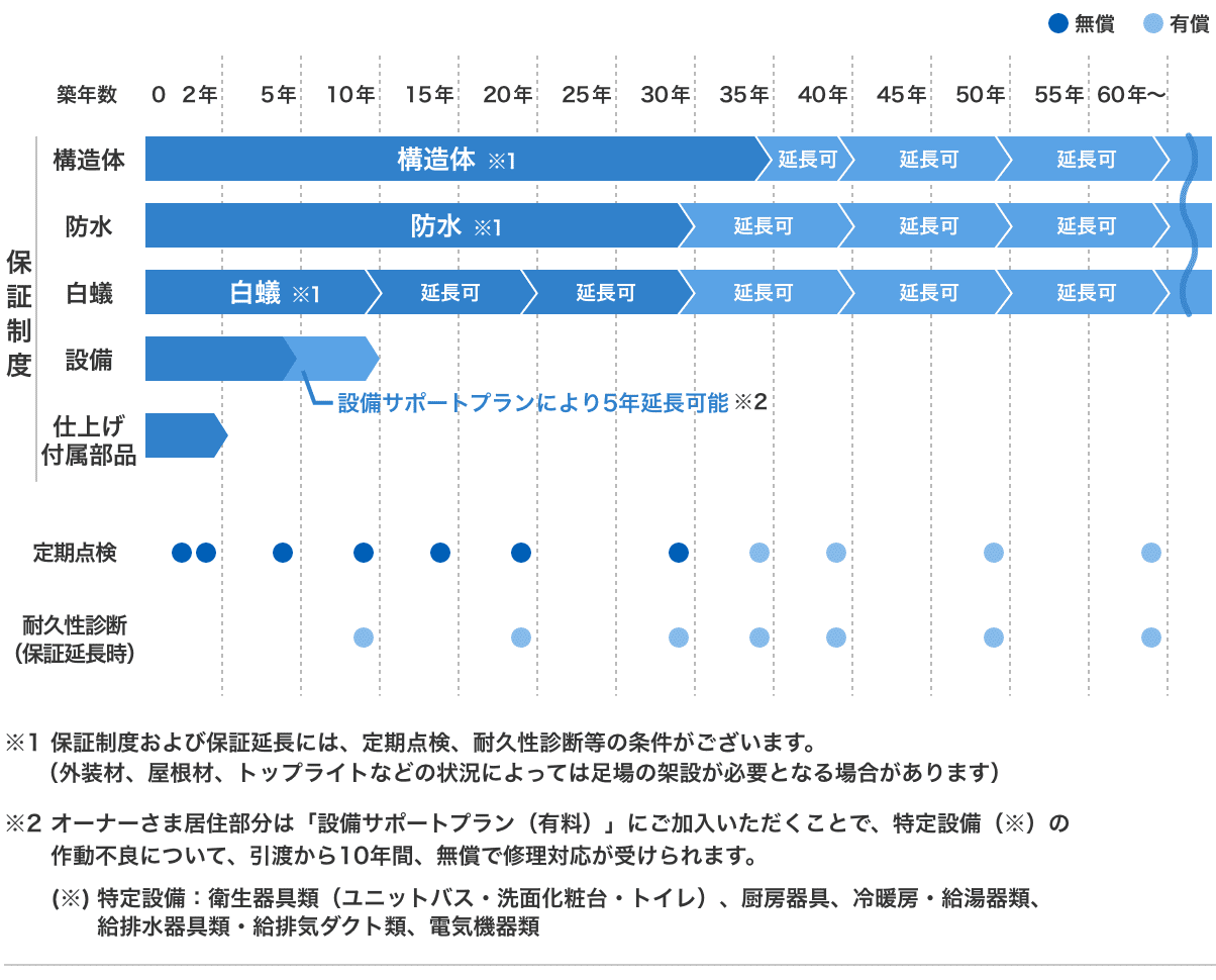 ②.ミサワホーム(ディーラー)またはミサワホーム(ディーラー)が指定するものが行う、住宅の耐久性に関する有償診断(耐久性診断)を欠かすことなく受けている事。耐久性診断(有償)は、35年目および40年目以降10年毎。構造体、白蟻、防水保証は満了時毎に行う必要があります。