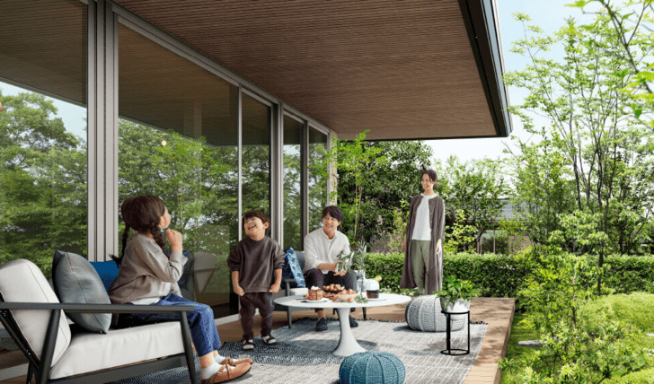 商品名の通り、LDK(ウチ)に設けた横に広がる大きな開口を介して約3mの深い軒が作るワイドなテラス(ソト)をシームレスにつないで、自然と一体になる、開放感のある間取りを得意としています。