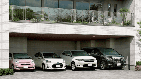 1.深い軒が雨から愛車を守ってくれるガレージ。