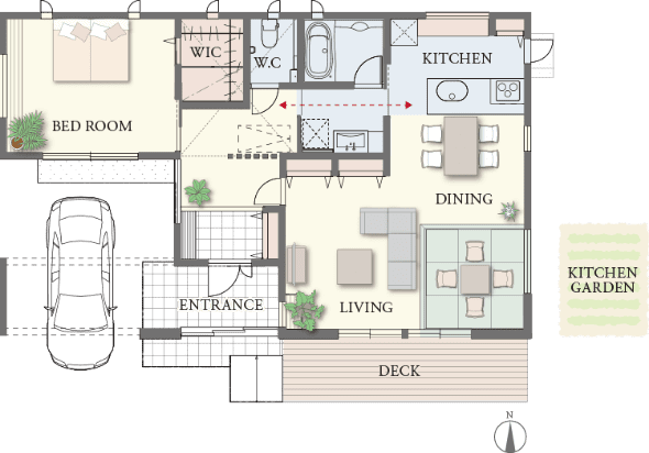 デッキとリビングの高さを合わせる事で空間がより広く感じられます。水周りは一ヶ所にまとめられており家事の事も考えられた間取りです。