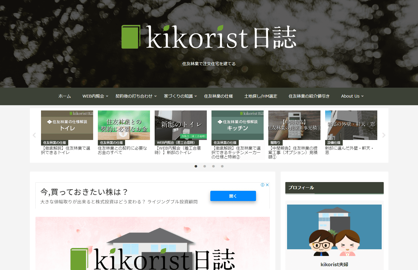 住友林業で3階建てを都内に建てた施主さんによる建築ブログです。土地と住宅メーカーを探すところから始まり、契約後の打ち合わせの様子なども書かれています。