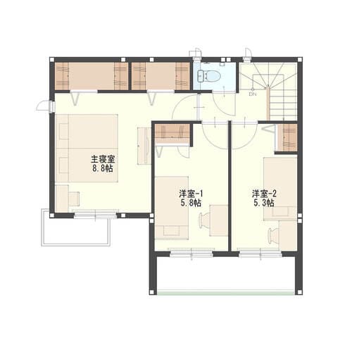 2会の廊下ホールはムダが出来やすい空間ですが、上がってすぐに収納、そしてトイレ。突き当たりには主寝室へ抜けられるウォークスルークローゼットが配置されています。